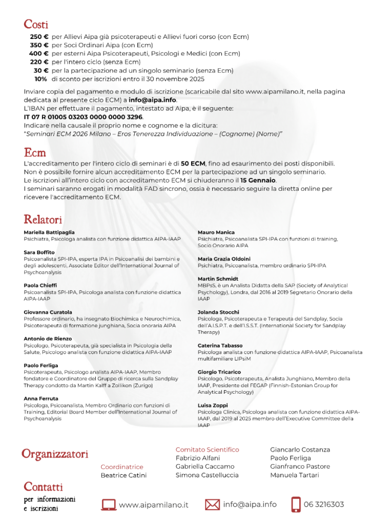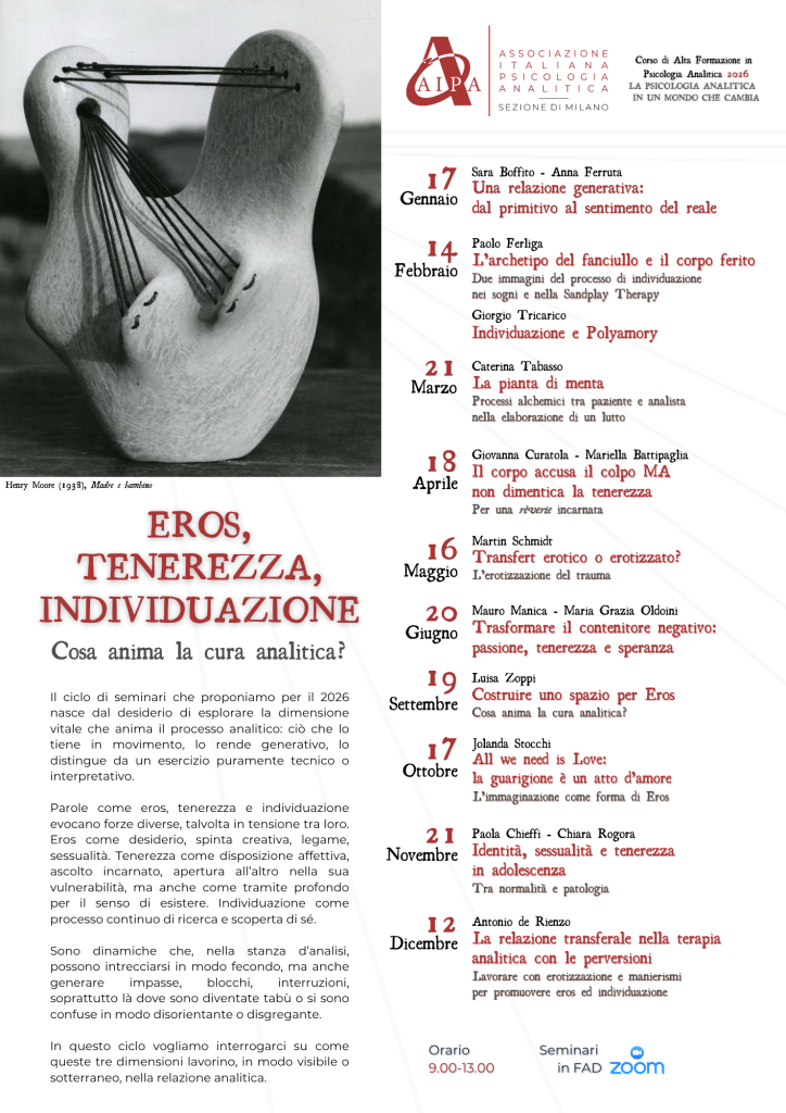 Siamo lieti di presentare il nuovo ciclo di Seminari ECM 2026 dal titolo EROS, TENEREZZA, INDIVIDUAZIONE. Cosa anima la cura analitica?