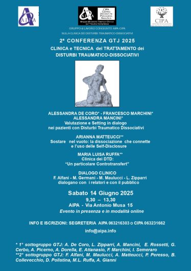 GRUPPO di LAVORO CONGIUNTO AIPA-CIPA SULLA CLINICA DEI DISTURBI TRAUMATICO-DISSOCIATIVI Care colleghe e cari colleghi, vogliamo ricordardare a tutte/i, che il 14 Giugno si terrà la 2ª Conferenza del 2025 organizzata dal nostro Gruppo di lavoro congiunto: “LA CLINICA DEI DISTURBI TRAUMATICO-DISSOCIATIVI” Sabato 14 Giugno 9.30- 13.30 AIPA –  Via Antonio Musa 15 Questa 2ª Conferenza […]