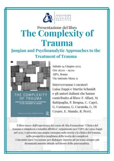 Presentazione del libro “The Complexity of Trauma. Jungian and Psychoanalytic Approaches to the Treatment of Trauma” Sabato 14 Giugno 2025 Ore 16:00 – 19:00 Sede AIPA Roma – Via Antonio Musa, 15 Interverranno i curatori Luisa Zoppi e Martin Schmidt e gli autori italiani che hanno contribuito al libro: F. Alfani, M. Battipaglia, P. Brogna, […]