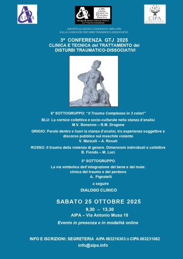 GRUPPO di LAVORO CONGIUNTO AIPA-CIPA SULLA CLINICA DEI DISTURBI TRAUMATICO-DISSOCIATIVI Care colleghe e cari colleghi, vogliamo ricordare a tutte/i che il 25 Ottobre si terrà la 3ª Conferenza del 2025 organizzata dal nostro Gruppo di lavoro. Le relazioni – presentate dal 6° e dal 5° sottogruppo – approfondiranno le seguenti tematiche: “LA DIMENSIONE COLLETTIVA E […]